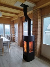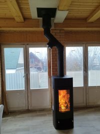 Пристенная высокая дизайнерская печь с панорамным обзором. Обзор огня с трех сторон. Оборудована большой остекленной дверкой выполненной в одной плоскости с корпусом печи и с двумя боковыми стеклами. Дверка высотой 600 мм и боковые стенки выполнены с небольшим радиальным изгибом. Ручка открывания утоплена внутрь дверки. Подсоединение к дымоходу сверху или сзади.